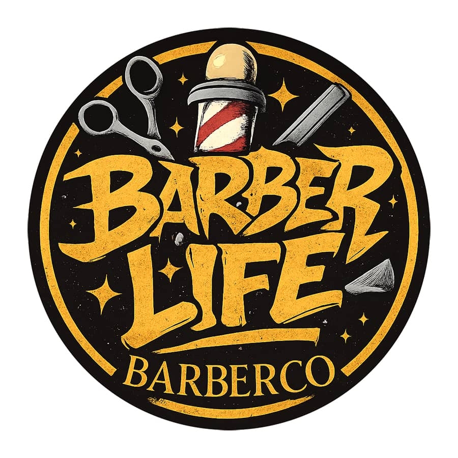 Štýlová barber samolepka BARBERCO Barber life z lesklého PVC. Priemer 10 cm, okrúhly tvar. Ideálny doplnok do každého barber shopu, na zrkadlo, dvere alebo pracovnú stanicu.