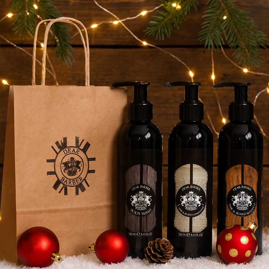 Darčeková sada kvalitného sprchového gélu, šampónu a kondicionéru od obľúbenej anglickej značky DEAR BARBER. Vďaka tejto sade budú vlasy a pokožka čisté, vyživené a budú mať príjemnú vôňu bergamotu a jantáru. Súčasťou sady je elegantná darčeková taška.