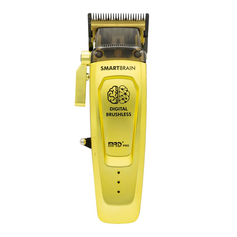 Profesionálny strihací strojček na vlasy MRD Pro Smart Brain clipper HC-90-4 Gold s výkonným bezkefovým DC motorom s 7200 ot./min., DLC ECHO čepeľou a až 2,5 h prevádzky. Kovové telo, USB-C nabíjanie a magnetické nástavce. Maximálna presnosť a top výkon pre barber shop.