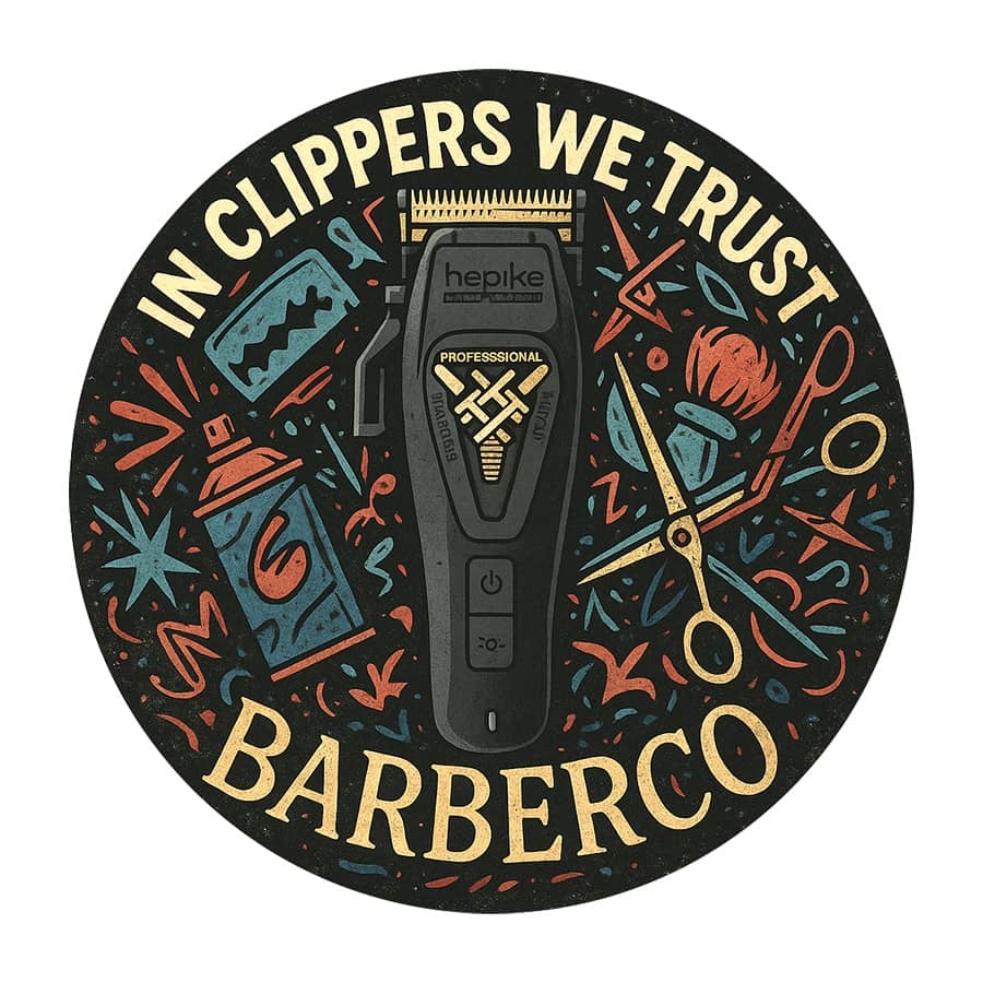 Štýlová barber samolepka BARBERCO In clippers we trust z lesklého PVC. Priemer 10 cm, okrúhly tvar. Ideálny doplnok do každého barber shopu, na zrkadlo, dvere alebo pracovnú stanicu.
