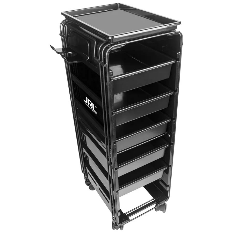 Elegantný čierny barber stolík na kolieskach od populárnej značky JRL Professional, ideálny na uskladnenie kaderníckeho vybavenia v barber shope či kaderníctve. Súčasťou je 5 zásuviek a držiak na sušič vlasov.