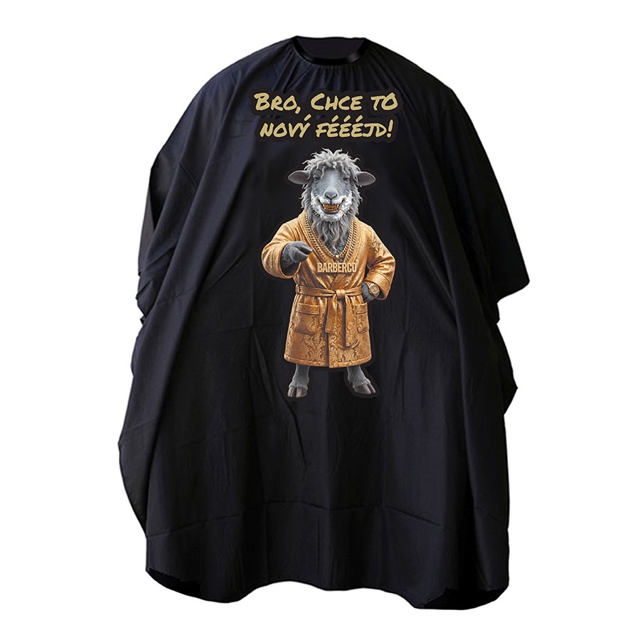 Limitovaná edícia barber pláštenky pre zákazníkov od značky BARBERCO. Na pláštenke je maskot Béčko v zlatom župane s nápisom "Bro, chce to nový féééjd!" Pláštenka je vyrobená z kvalitného ponžé materiálu, takže je vodeodolná, lesklá a hodvábna na dotyk.